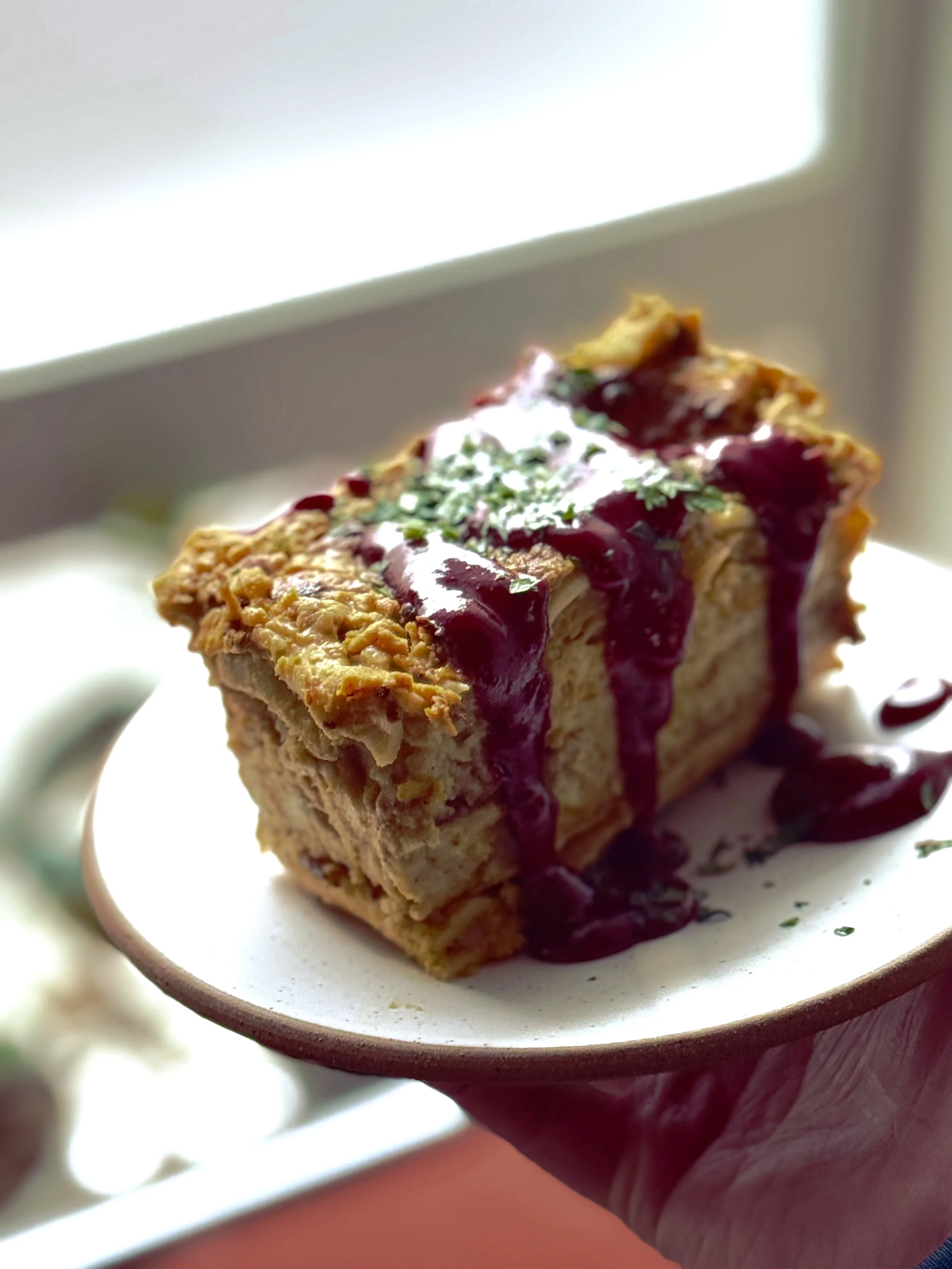 All your favorite Thanksgiving flavors balanced perfectly in one delicious stack, including "turkey", root and potato mash, squash ragù, stuffing, and béchamel topped with pie crust and cranberry sauce.